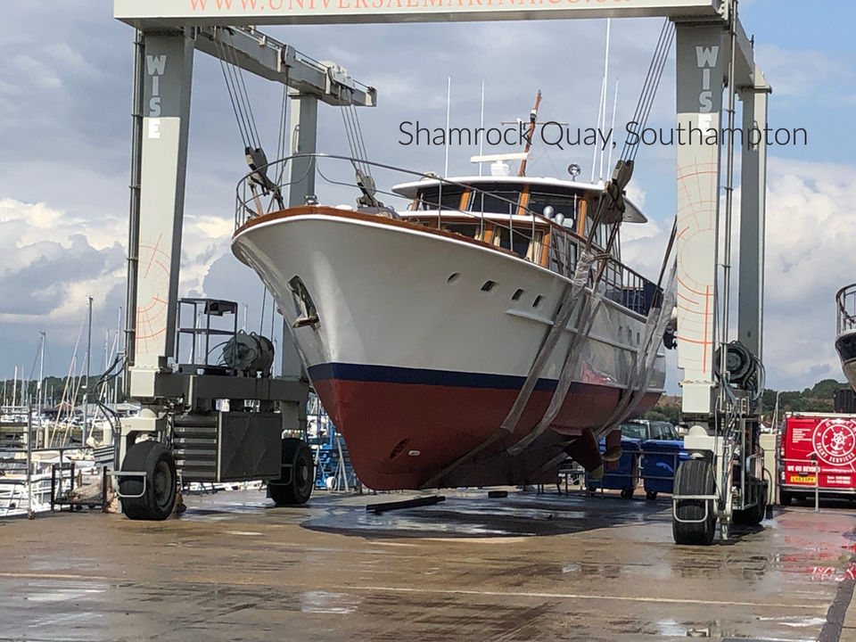The topsides have been finished in Awlcraft 2000 Snow white. The original Leyland Daff six-cylinder 200hp engines are being rebuilt and all new mechanical, electrical and domestic systems installed. Most of the original walnut panelling will remain, including the boarding ladder. More updates to come as we progress into the launch next summer.